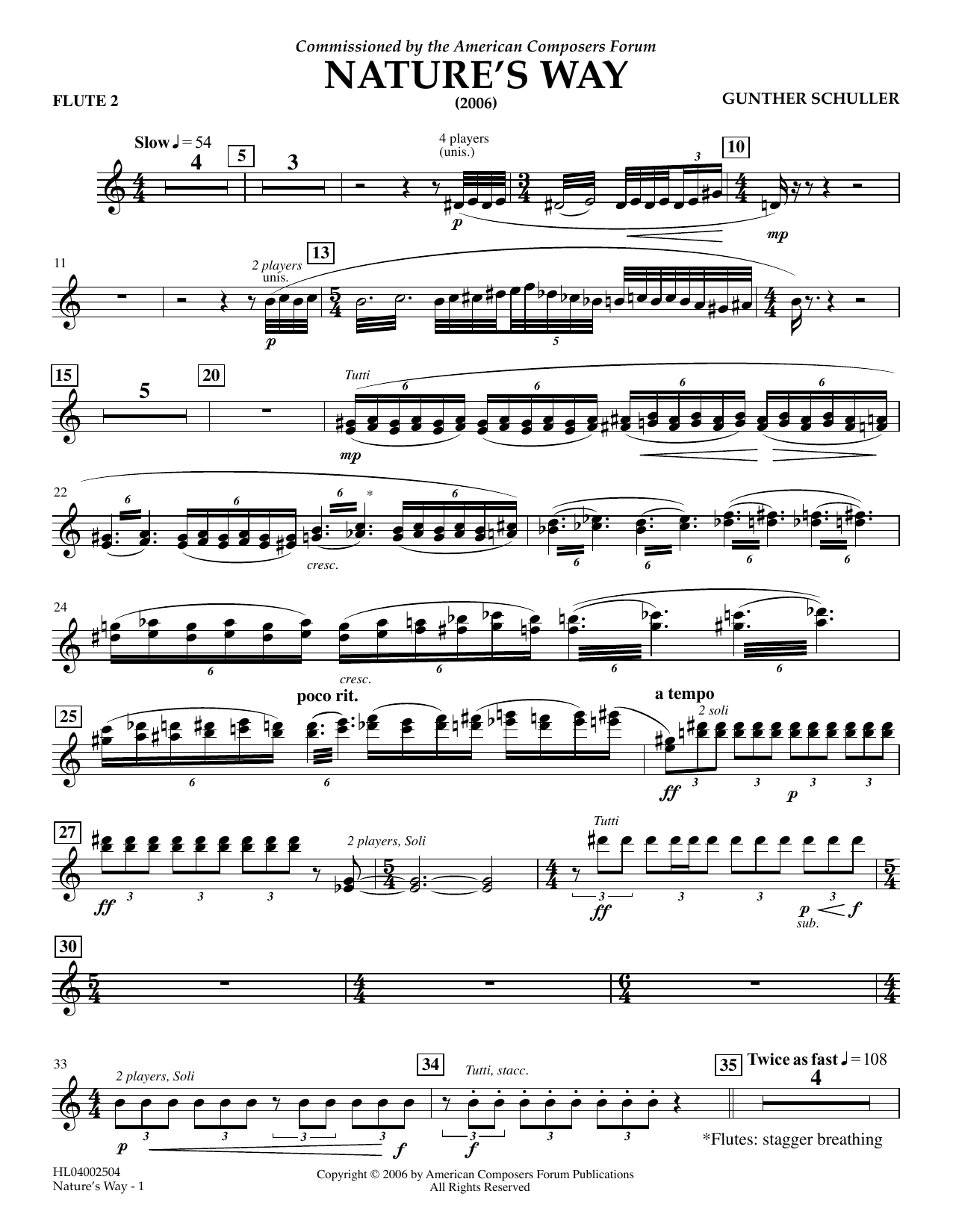 Download or print Gunther Schuller Nature's Way - Flute 2 sheet music, chords and digital score arranged for Concert Band. This Concert score includes 2 page(s).