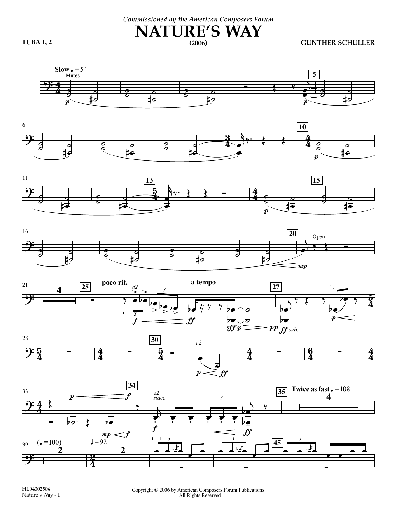 Download or print Gunther Schuller Nature's Way - Tuba 1 & 2 sheet music, chords and digital score arranged for Concert Band. This Concert score includes 2 page(s).