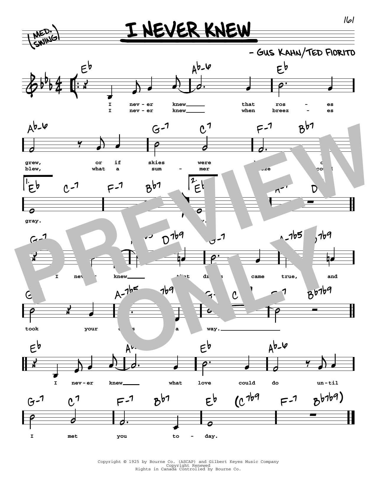 Download or print Gus Kahn I Never Knew (Low Voice) sheet music, chords and digital score arranged for Real Book – Melody, Lyrics & Chords. This Jazz score includes 1 page(s).