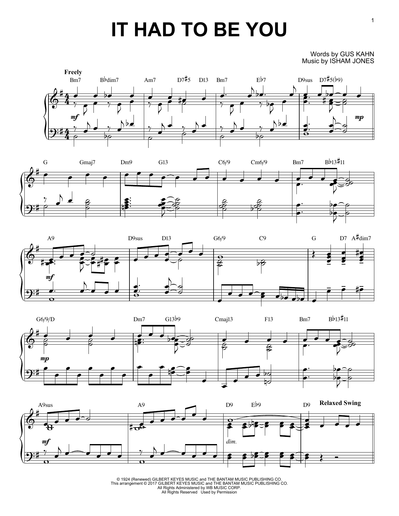 Download or print Gus Kahn It Had To Be You [Jazz version] sheet music, chords and digital score arranged for Piano Solo. This Jazz score includes 3 page(s).