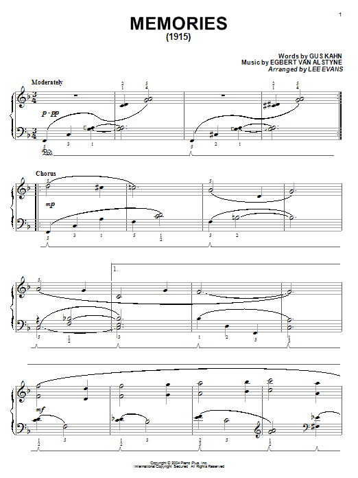 Download or print Gus Kahn Memories sheet music, chords and digital score arranged for Piano Solo. This Country score includes 3 page(s).