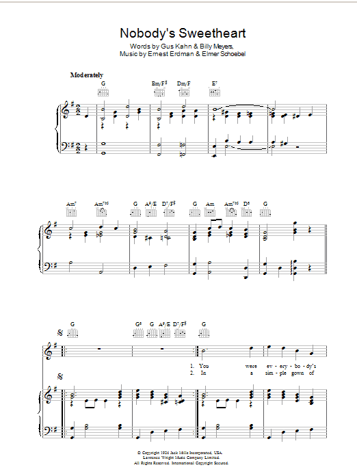 Download or print Gus Kahn Nobody's Sweetheart sheet music, chords and digital score arranged for Piano, Vocal & Guitar Chords. This Pop score includes 6 page(s).