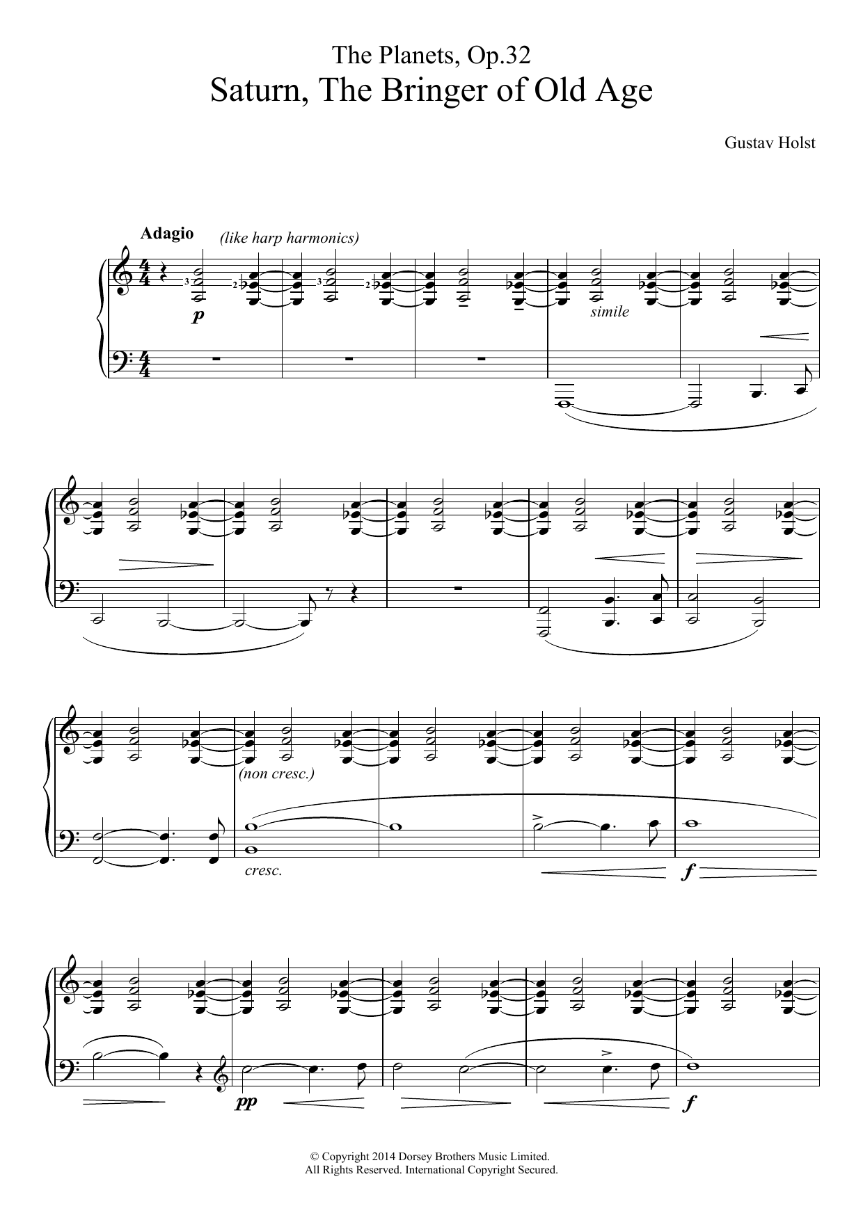 Download or print Gustav Holst The Planets, Op. 32: Saturn, the Bringer of Old Age (abridged version) sheet music, chords and digital score arranged for Piano Solo. This Classical score includes 4 page(s).