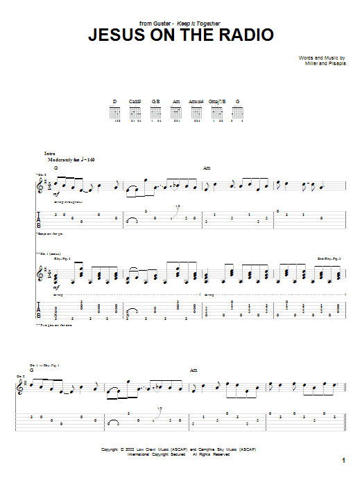 Download or print Guster Jesus On The Radio sheet music, chords and digital score arranged for Guitar Tab. This Pop score includes 6 page(s).