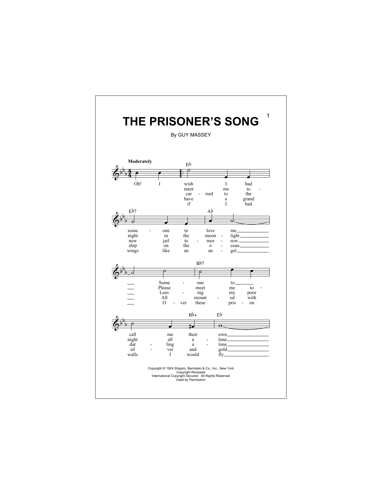 Download or print Guy Massey The Prisoner's Song sheet music, chords and digital score arranged for Real Book – Melody, Lyrics & Chords. This Jazz score includes 1 page(s).