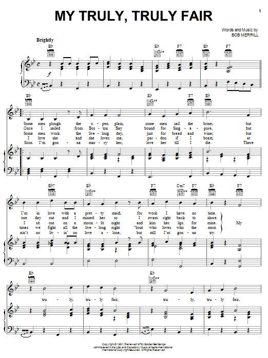 Download or print Guy Mitchell My Truly, Truly Fair sheet music, chords and digital score arranged for Piano, Vocal & Guitar Chords (Right-Hand Melody). This Pop score includes 2 page(s).