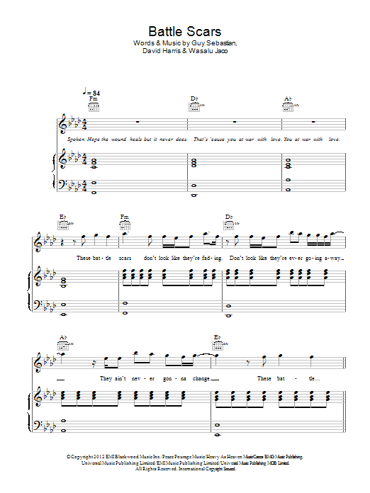 Download or print Guy Sebastian Featuring Lupe Fiasco Battle Scars sheet music, chords and digital score arranged for Piano, Vocal & Guitar Chords. This Hip-Hop score includes 7 page(s).