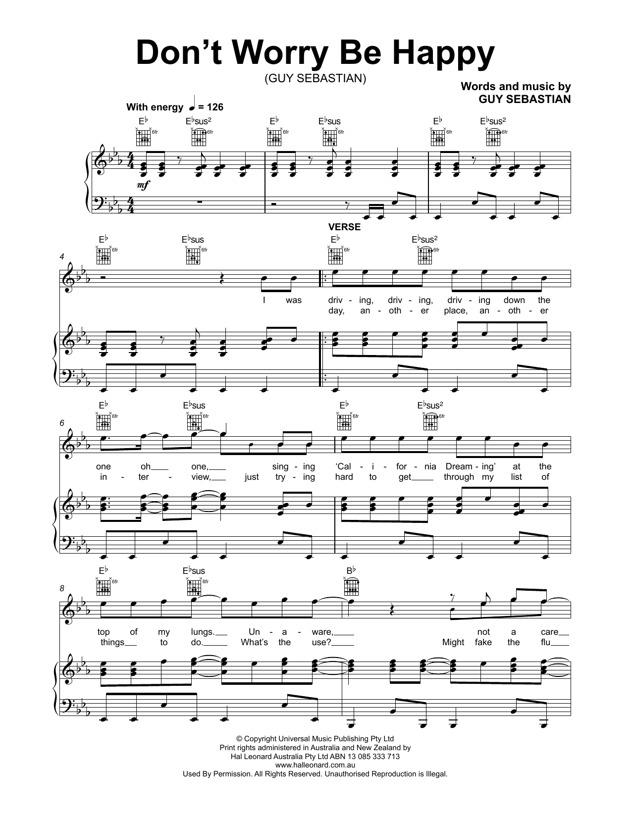 Download or print Guy Sebastian Don't Worry Be Happy sheet music, chords and digital score arranged for Piano, Vocal & Guitar Chords (Right-Hand Melody). This Pop score includes 7 page(s).