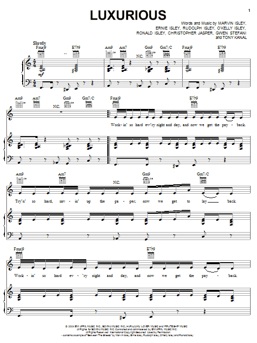 Download or print Gwen Stefani Luxurious sheet music, chords and digital score arranged for Piano, Vocal & Guitar Chords (Right-Hand Melody). This Pop score includes 7 page(s).