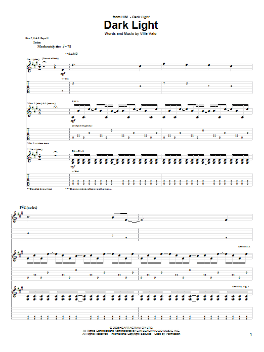 Download or print HIM Dark Light sheet music, chords and digital score arranged for Guitar Tab. This Metal score includes 9 page(s).