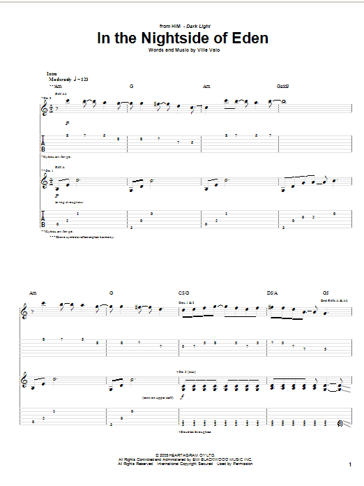 Download or print HIM In The Nightside Of Eden sheet music, chords and digital score arranged for Guitar Tab. This Metal score includes 11 page(s).
