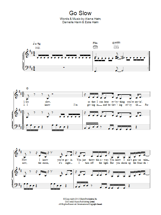 Download or print Haim Go Slow sheet music, chords and digital score arranged for Piano, Vocal & Guitar Chords. This Pop score includes 6 page(s).