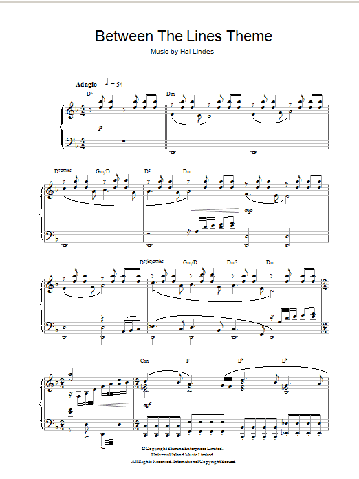 Download or print Hal Lindes Between The Lines Theme sheet music, chords and digital score arranged for Piano Solo. This Film/TV score includes 2 page(s).