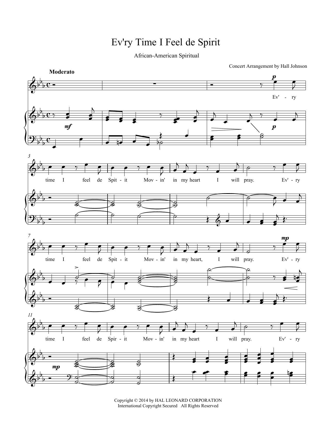 Download or print Hall Johnson Ev'ry Time I Feel de Spirit (E-flat) sheet music, chords and digital score arranged for Piano & Vocal. This Classical score includes 6 page(s).