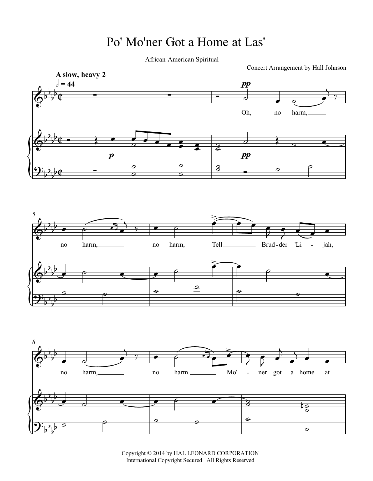 Download or print Hall Johnson Po' Mo'ner Got a Home at Las' (F minor) sheet music, chords and digital score arranged for Piano & Vocal. This Classical score includes 7 page(s).