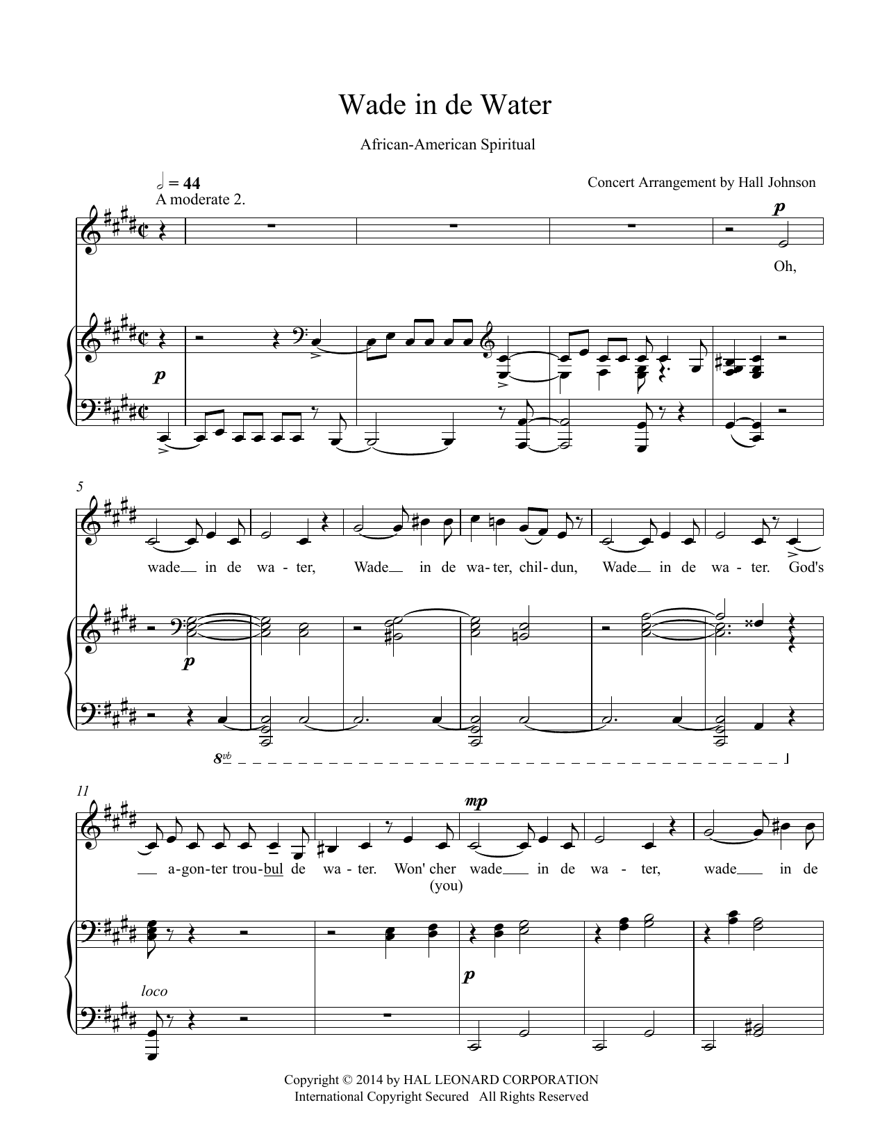 Download or print Hall Johnson Wade in de Water (C-sharp minor) sheet music, chords and digital score arranged for Piano & Vocal. This Classical score includes 5 page(s).
