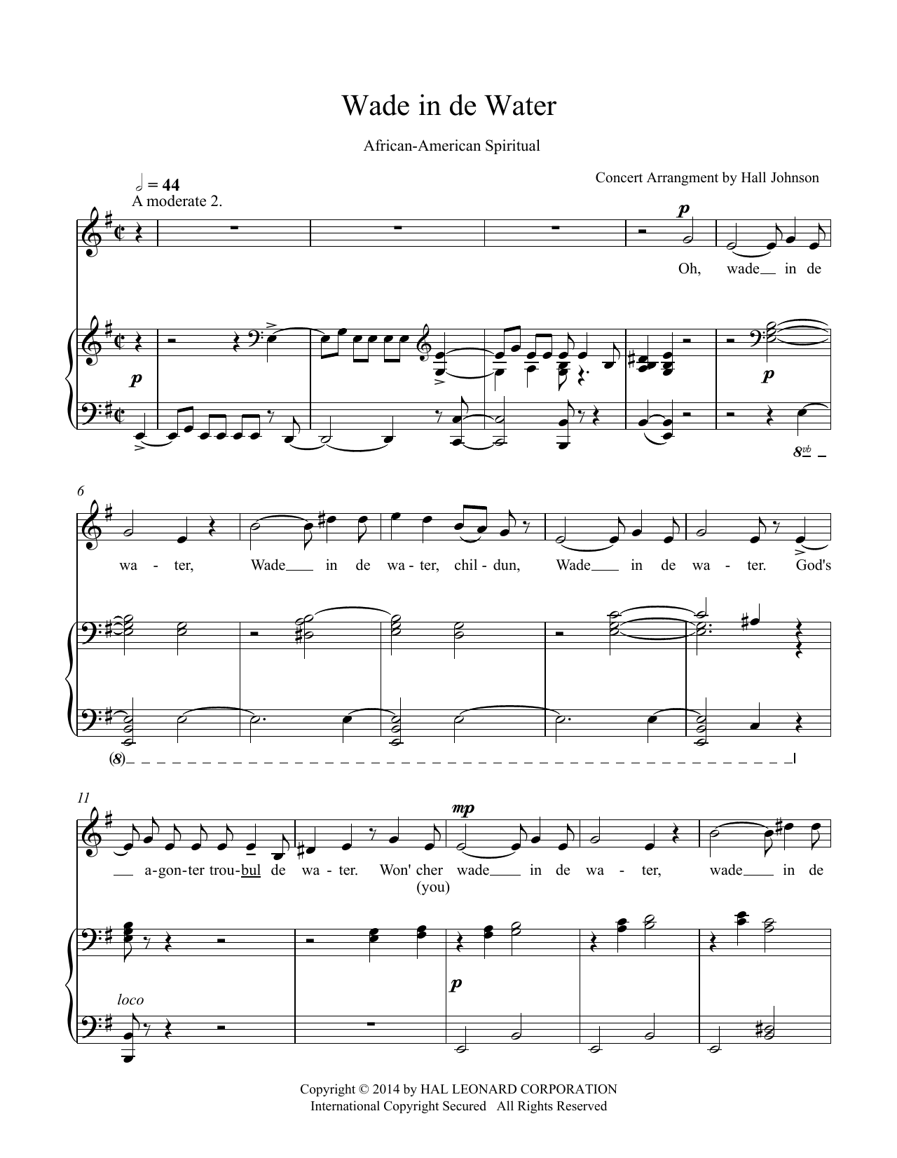 Download or print Hall Johnson Wade in de Water (E minor) sheet music, chords and digital score arranged for Piano & Vocal. This Classical score includes 5 page(s).