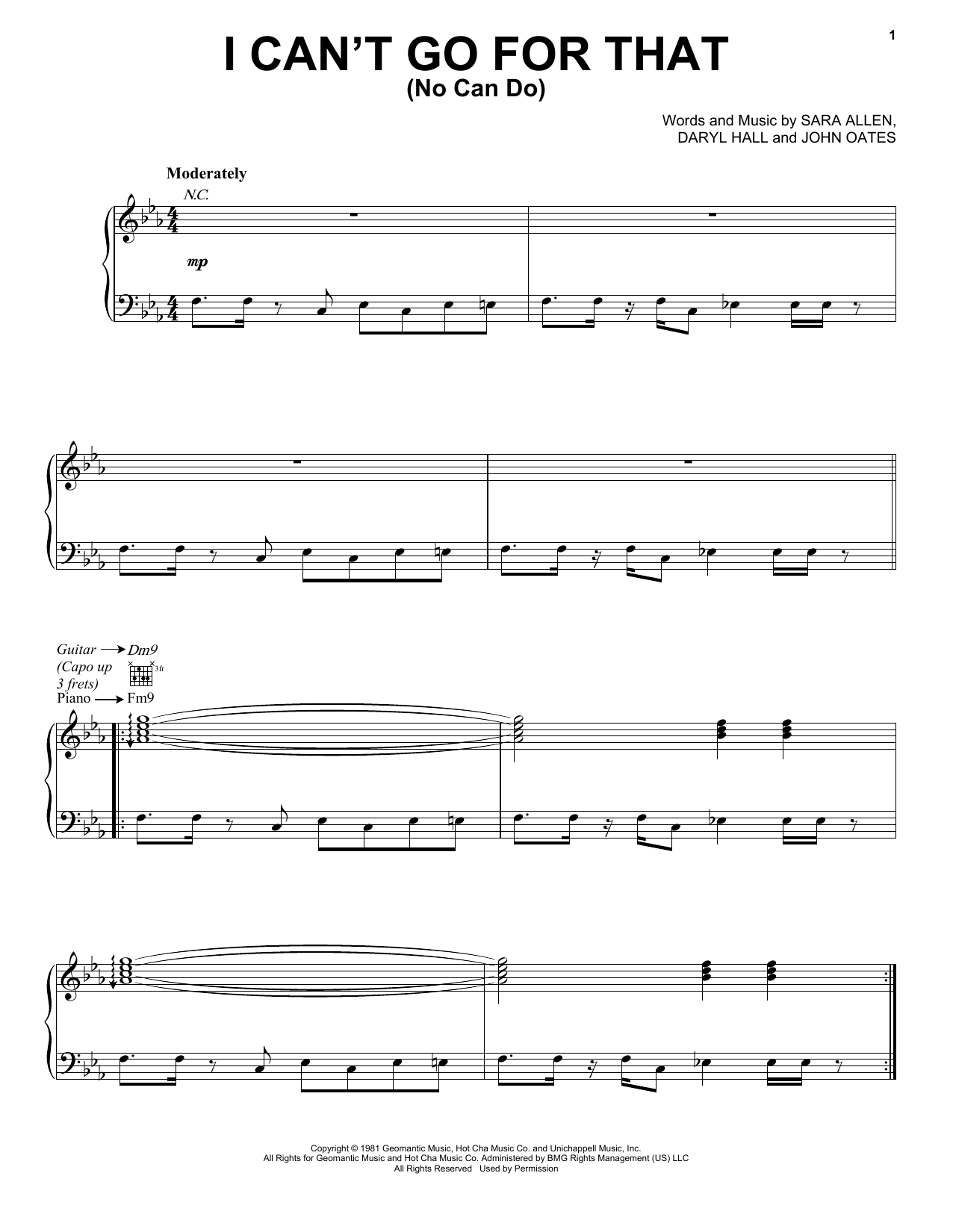 Download or print Hall & Oates I Can't Go For That sheet music, chords and digital score arranged for Piano, Vocal & Guitar Chords (Right-Hand Melody). This Pop score includes 5 page(s).