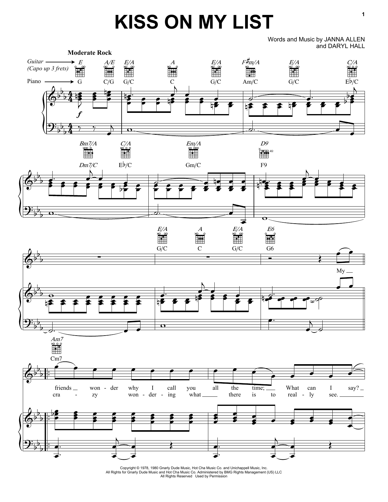 Download or print Hall & Oates Kiss On My List sheet music, chords and digital score arranged for Lead Sheet / Fake Book. This Pop score includes 1 page(s).