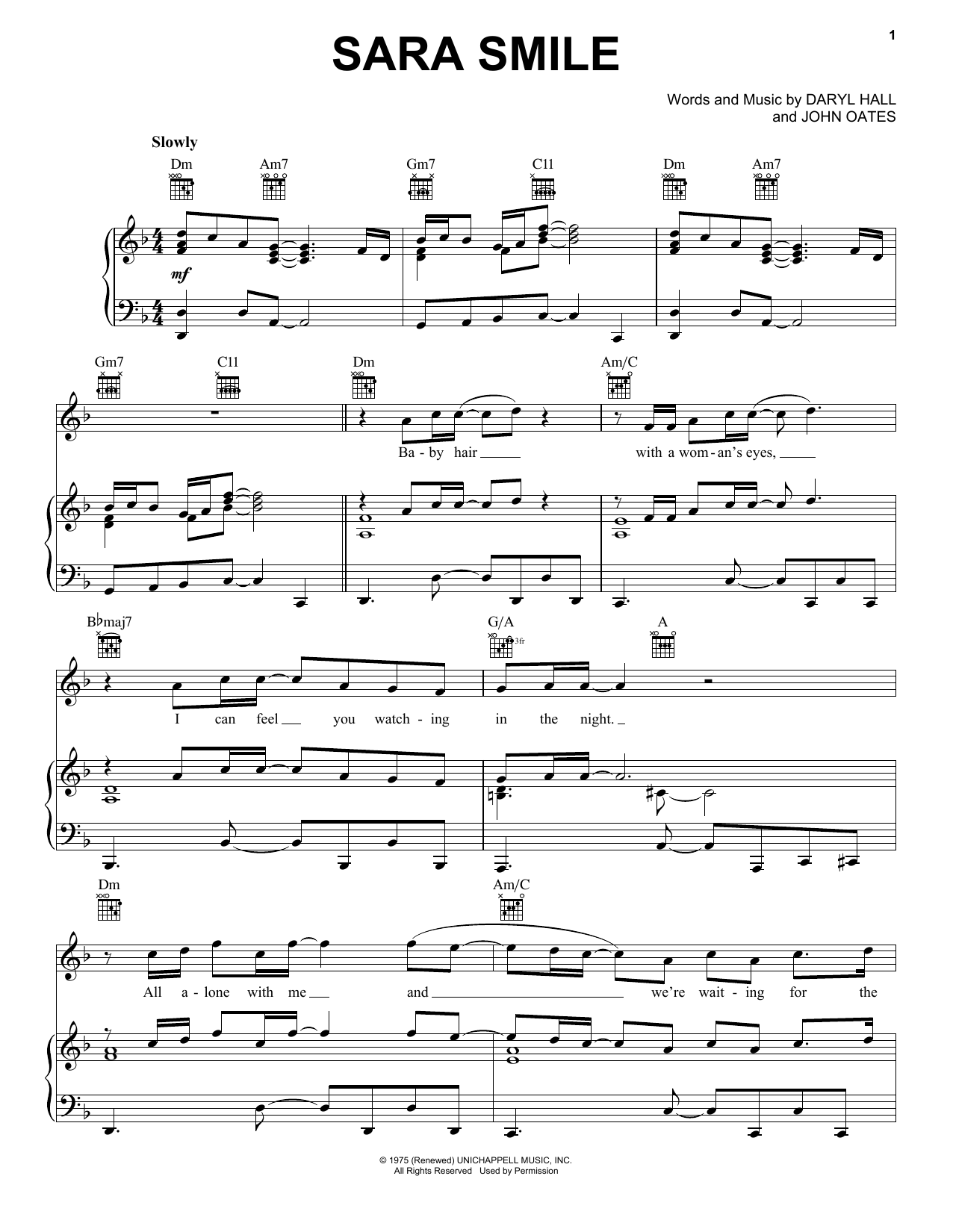 Download or print Hall & Oates Sara Smile sheet music, chords and digital score arranged for Piano, Vocal & Guitar Chords (Right-Hand Melody). This Love score includes 4 page(s).