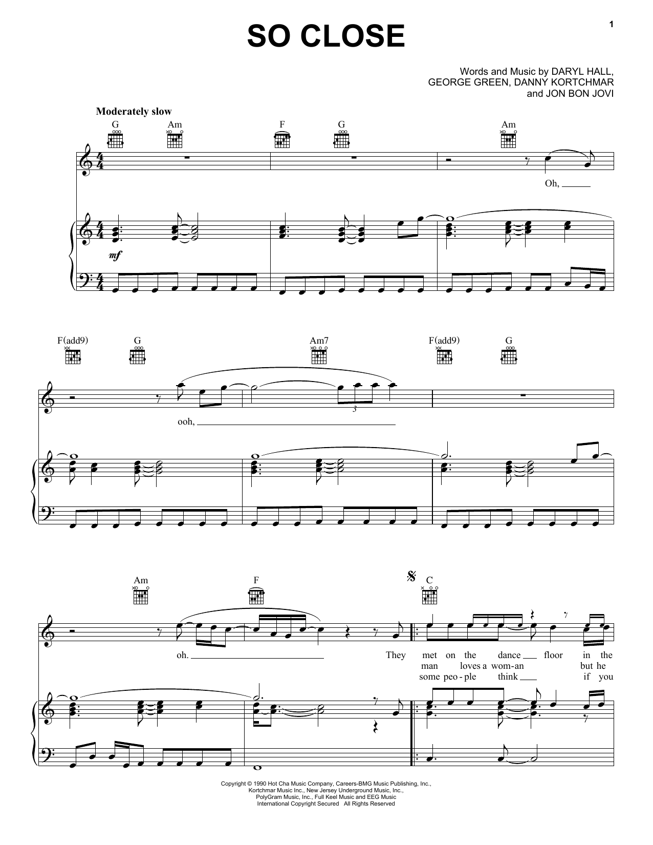 Download or print Hall & Oates So Close sheet music, chords and digital score arranged for Piano, Vocal & Guitar Chords (Right-Hand Melody). This Pop score includes 7 page(s).