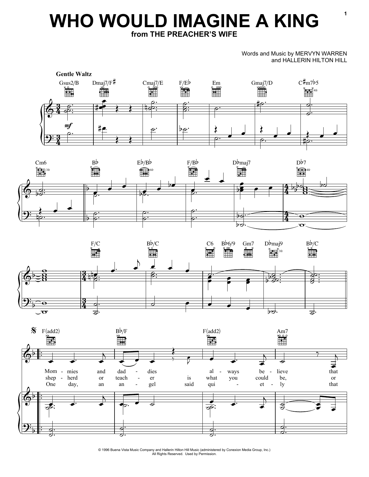 Download or print Hallerin Hilton Hill Who Would Imagine A King sheet music, chords and digital score arranged for Piano, Vocal & Guitar Chords (Right-Hand Melody). This Christmas score includes 4 page(s).