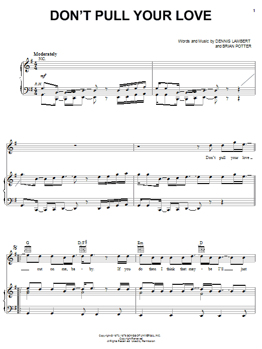 Download or print Hamilton, Joe Frank & Reynolds Don't Pull Your Love sheet music, chords and digital score arranged for Piano, Vocal & Guitar Chords (Right-Hand Melody). This Film/TV score includes 5 page(s).