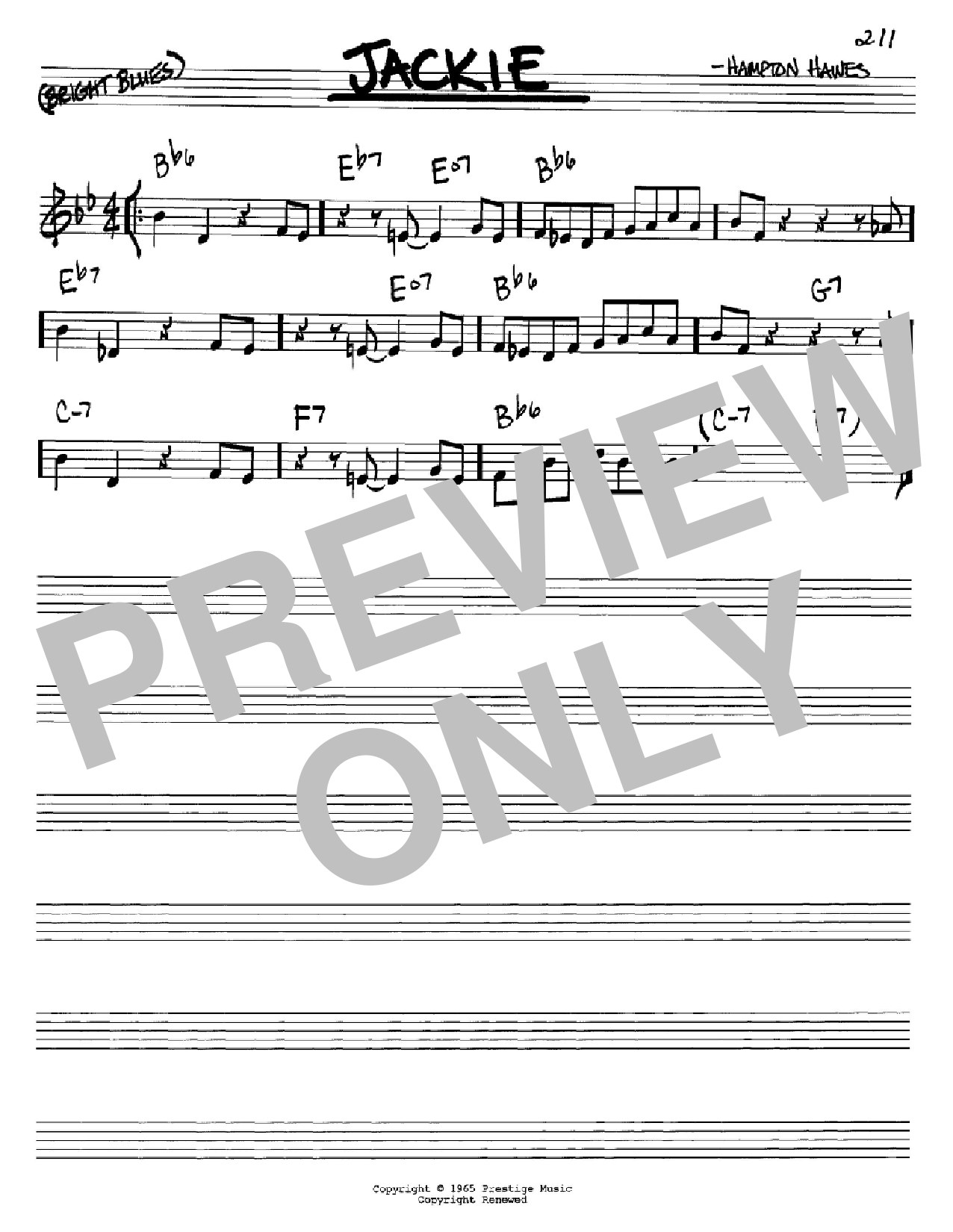 Download or print Hampton Hawes Jackie sheet music, chords and digital score arranged for Real Book – Melody & Chords – C Instruments. This Jazz score includes 1 page(s).