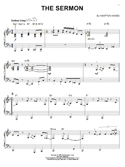 Download or print Hampton Hawes The Sermon (arr. Brent Edstrom) sheet music, chords and digital score arranged for Piano Solo. This Jazz score includes 6 page(s).