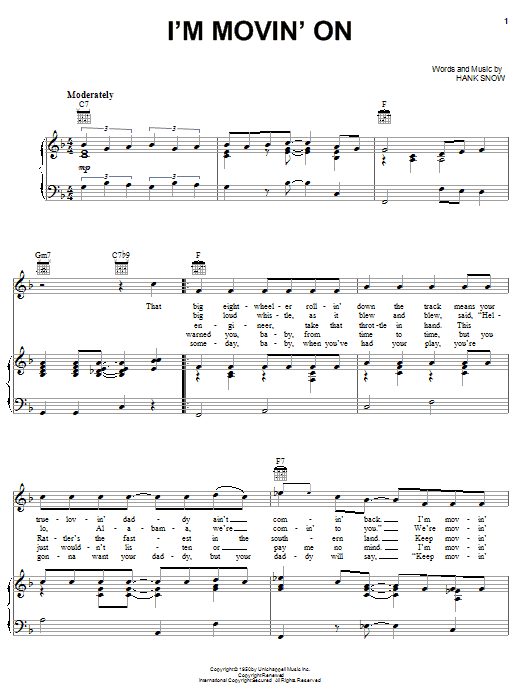 Download or print Hank Snow I'm Movin' On sheet music, chords and digital score arranged for Piano, Vocal & Guitar Chords (Right-Hand Melody). This Country score includes 2 page(s).