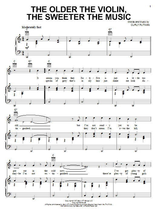 Download or print Hank Thompson The Older The Violin, The Sweeter The Music sheet music, chords and digital score arranged for Piano, Vocal & Guitar Chords (Right-Hand Melody). This Country score includes 3 page(s).