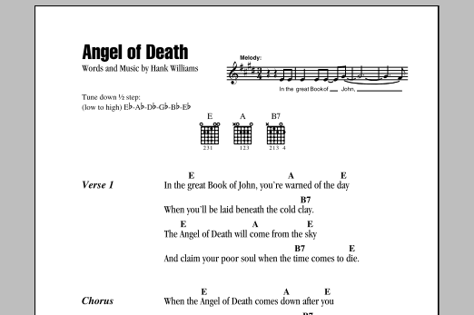 Download or print Hank Williams Angel Of Death sheet music, chords and digital score arranged for Piano, Vocal & Guitar Chords (Right-Hand Melody). This Country score includes 2 page(s).