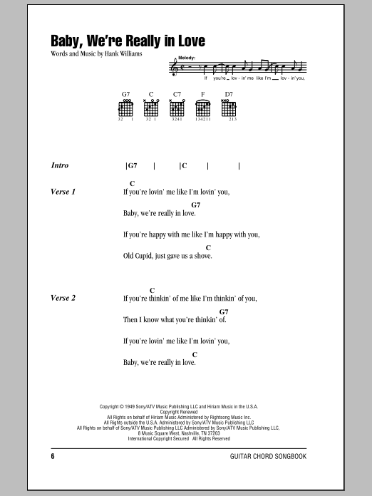 Download or print Hank Williams Baby, We're Really In Love sheet music, chords and digital score arranged for Piano, Vocal & Guitar Chords (Right-Hand Melody). This Country score includes 3 page(s).