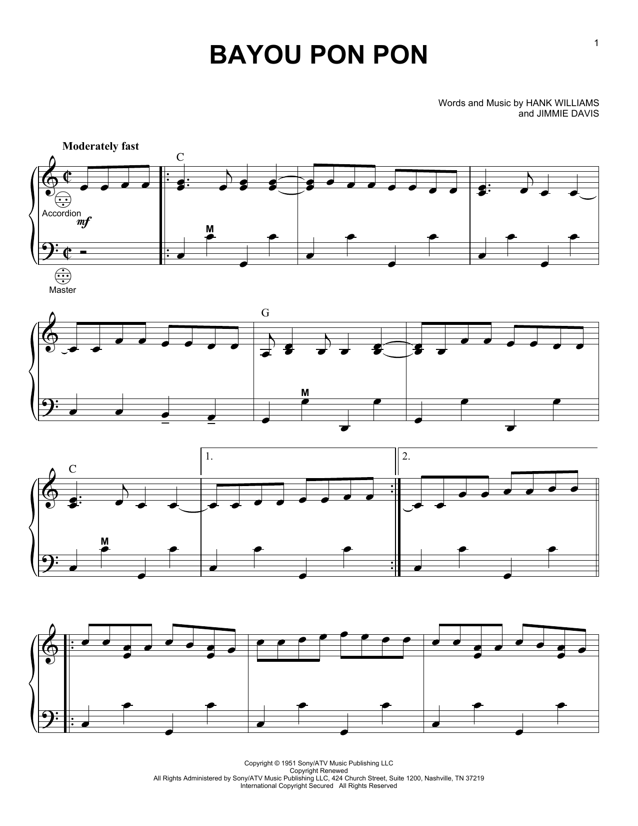 Download or print Hank Williams Bayou Pon Pon sheet music, chords and digital score arranged for Accordion. This Country score includes 4 page(s).