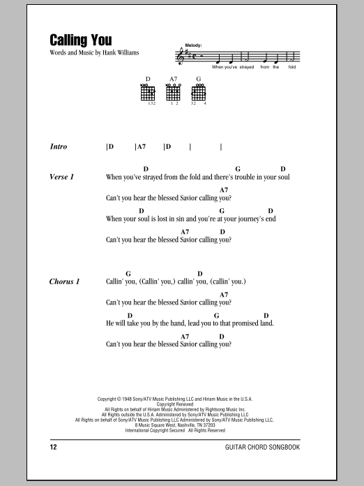 Download or print Hank Williams Calling You sheet music, chords and digital score arranged for Piano, Vocal & Guitar Chords (Right-Hand Melody). This Country score includes 3 page(s).