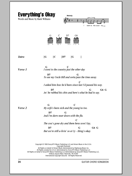 Download or print Hank Williams Everything's Okay sheet music, chords and digital score arranged for Piano, Vocal & Guitar Chords (Right-Hand Melody). This Country score includes 2 page(s).