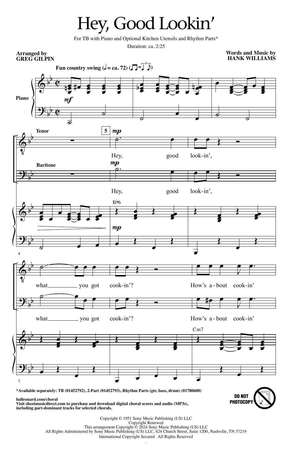 Download or print Hank Williams Hey, Good Lookin' (arr. Greg Gilpin) sheet music, chords and digital score arranged for TB Choir. This Country score includes 10 page(s).