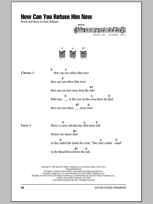 Download or print Hank Williams How Can You Refuse Him Now sheet music, chords and digital score arranged for Piano, Vocal & Guitar Chords (Right-Hand Melody). This Country score includes 3 page(s).