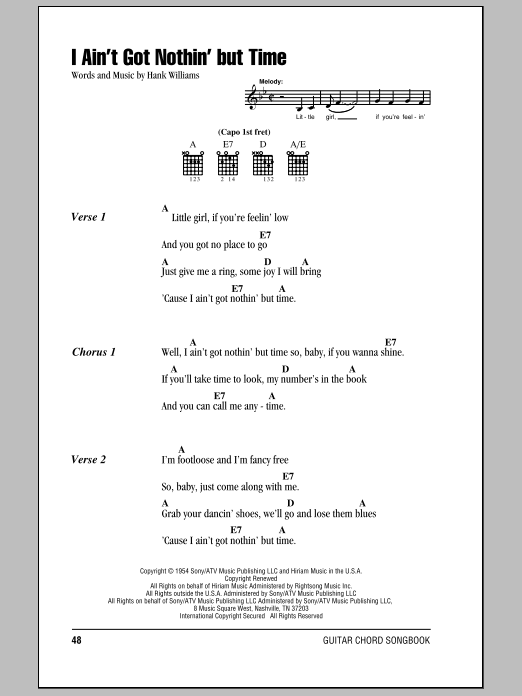 Download or print Hank Williams I Ain't Got Nothing But Time sheet music, chords and digital score arranged for Piano, Vocal & Guitar Chords (Right-Hand Melody). This Country score includes 3 page(s).