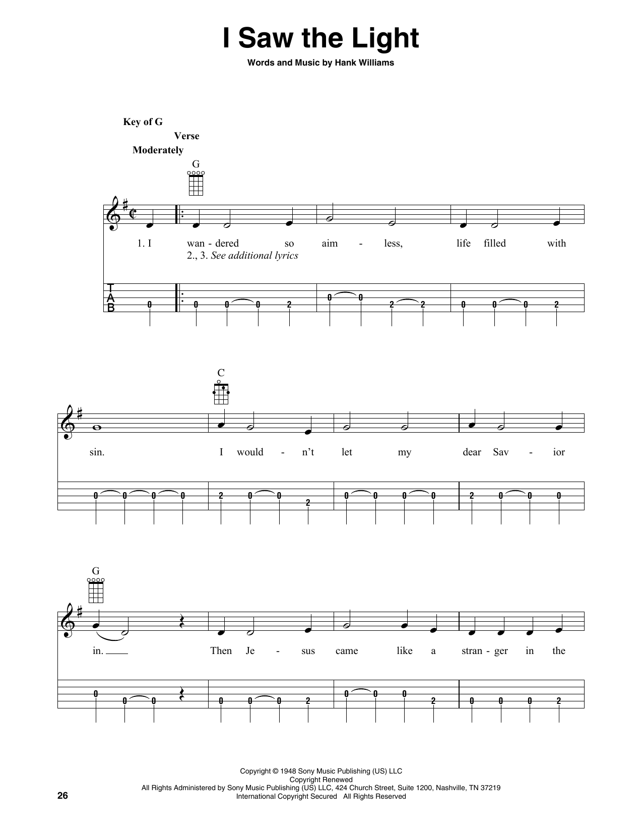 Download or print Hank Williams I Saw The Light (arr. Fred Sokolow) sheet music, chords and digital score arranged for Banjo Tab. This Country score includes 3 page(s).