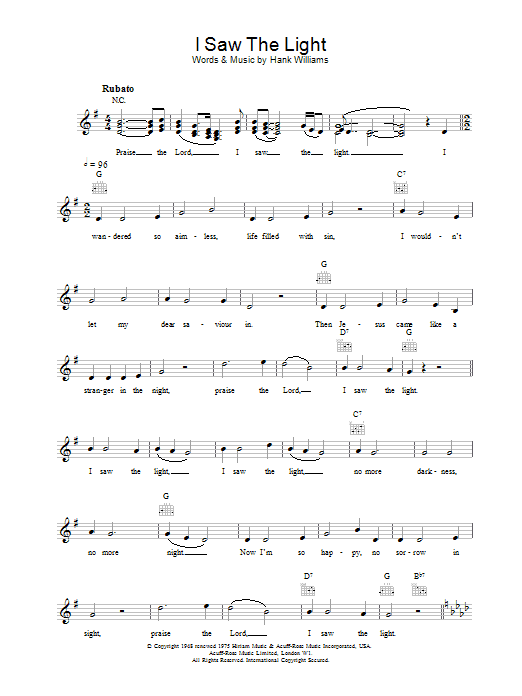 Download or print Hank Williams I Saw The Light sheet music, chords and digital score arranged for Super Easy Piano. This Country score includes 2 page(s).