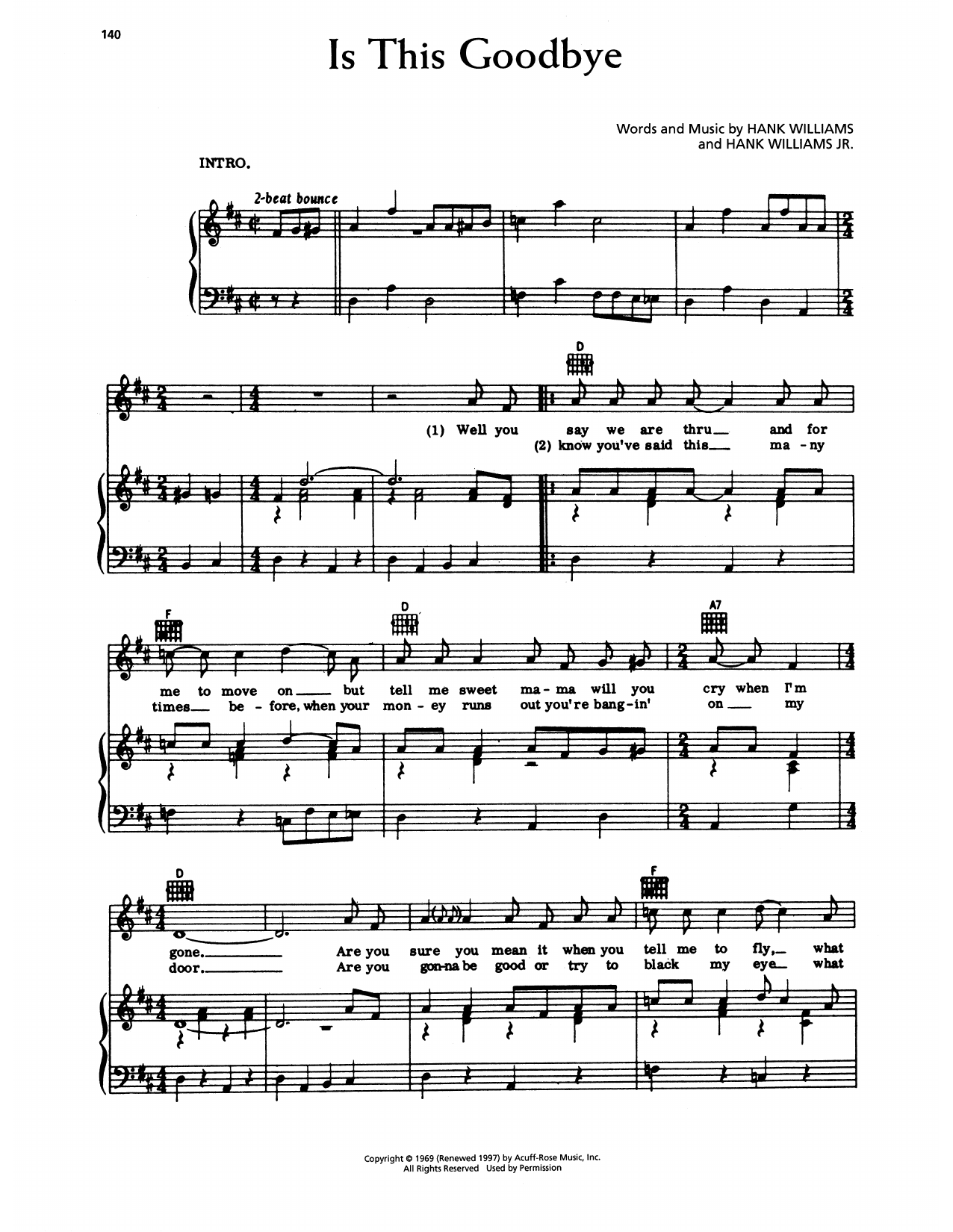Download or print Hank Williams Is This Goodbye sheet music, chords and digital score arranged for Piano, Vocal & Guitar Chords (Right-Hand Melody). This Country score includes 3 page(s).