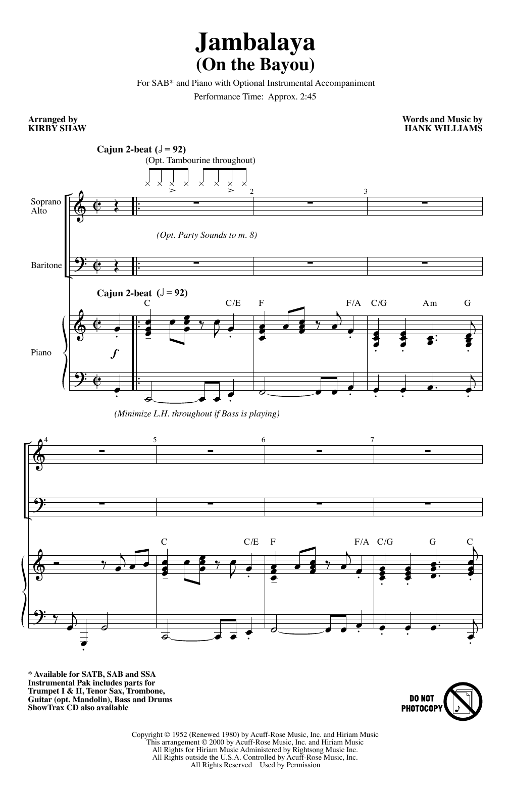 Download or print Hank Williams Jambalaya (On The Bayou) (arr. Kirby Shaw) sheet music, chords and digital score arranged for SSA Choir. This Country score includes 10 page(s).