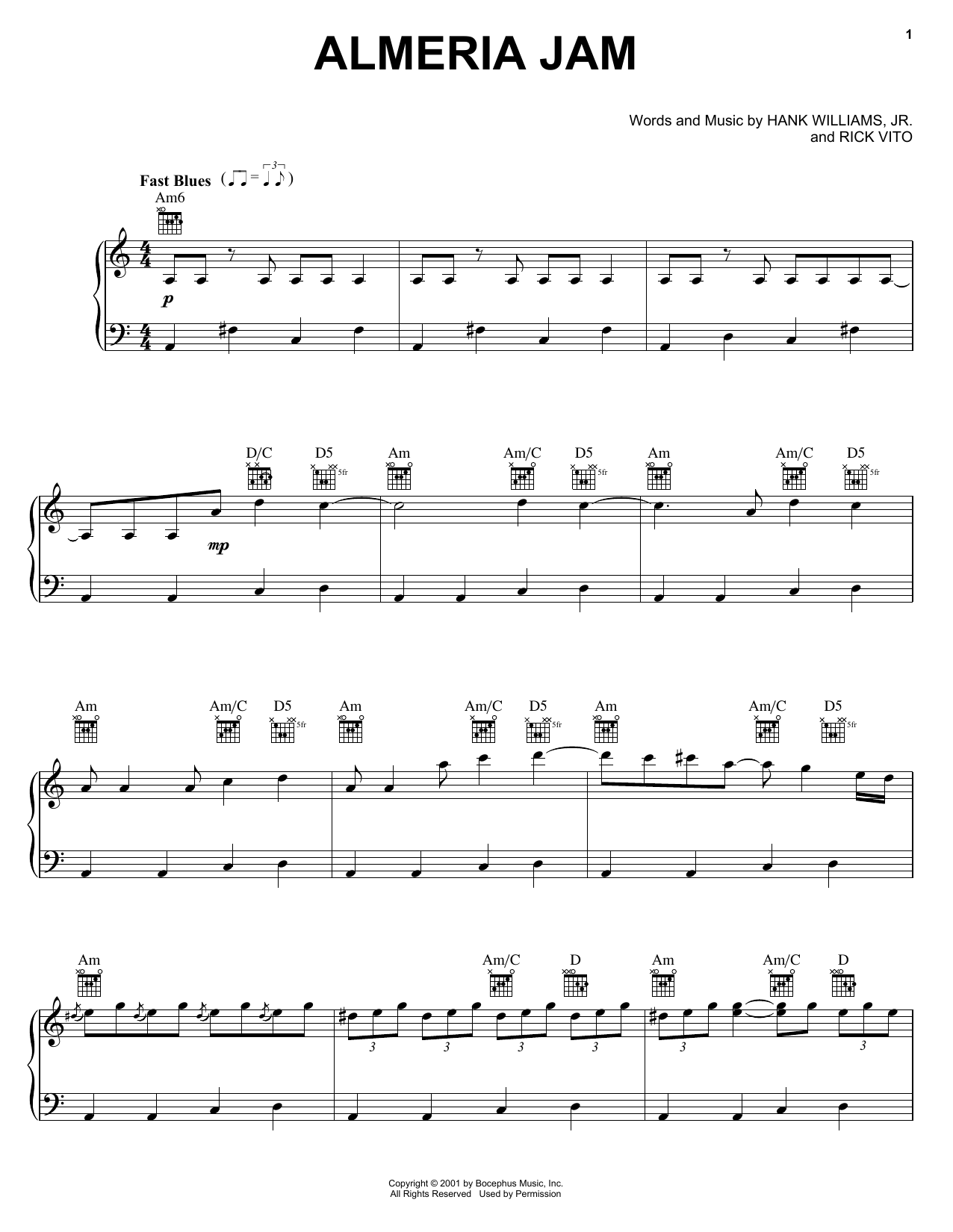 Download or print Hank Williams, Jr. Almeria Jam sheet music, chords and digital score arranged for Piano, Vocal & Guitar Chords (Right-Hand Melody). This Country score includes 6 page(s).
