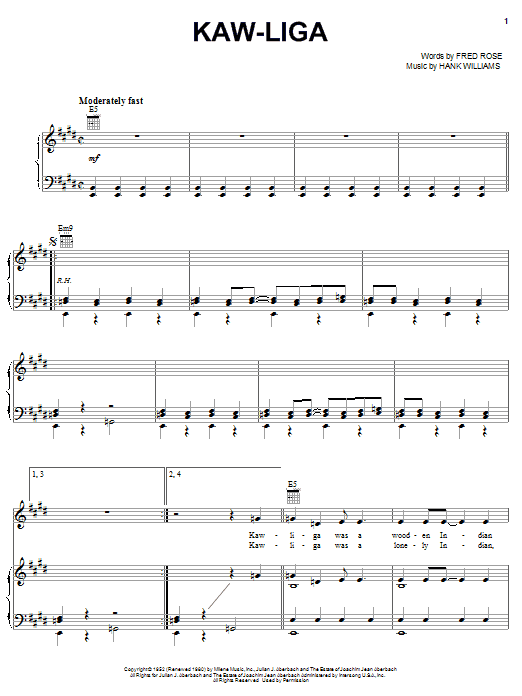 Download or print Hank Williams Kaw-Liga sheet music, chords and digital score arranged for Easy Piano. This Country score includes 5 page(s).