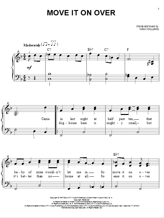 Download or print Hank Williams Move It On Over sheet music, chords and digital score arranged for Easy Piano. This Country score includes 3 page(s).