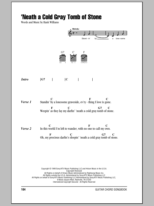 Download or print Hank Williams 'Neath A Cold Gray Tomb Of Stone sheet music, chords and digital score arranged for Piano, Vocal & Guitar Chords (Right-Hand Melody). This Country score includes 2 page(s).