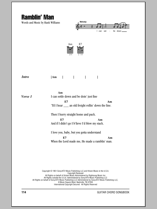 Download or print Hank Williams Ramblin' Man sheet music, chords and digital score arranged for Piano, Vocal & Guitar Chords (Right-Hand Melody). This Country score includes 2 page(s).