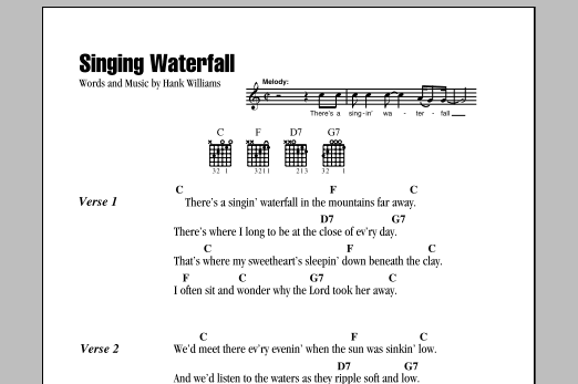 Download or print Hank Williams Singing Waterfall sheet music, chords and digital score arranged for Piano, Vocal & Guitar Chords (Right-Hand Melody). This Country score includes 2 page(s).