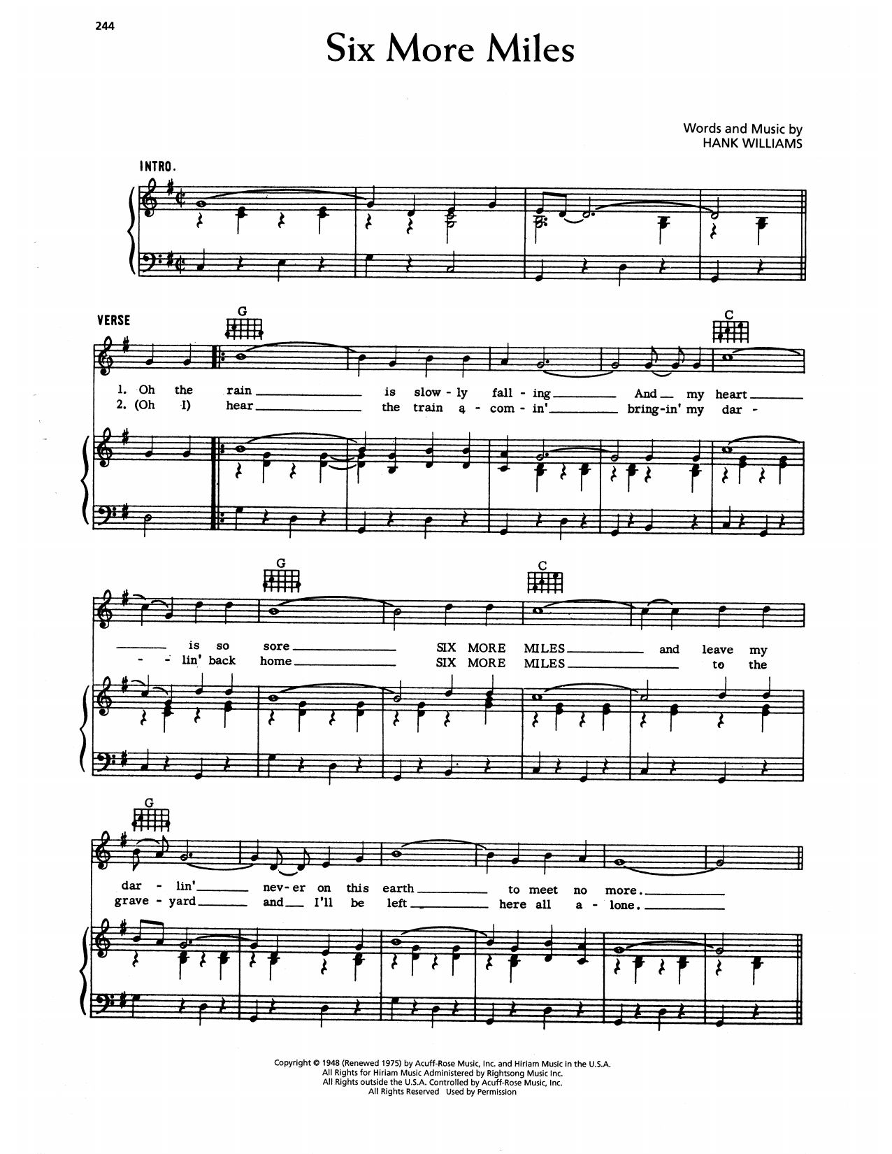 Download or print Hank Williams Six More Miles sheet music, chords and digital score arranged for Piano, Vocal & Guitar Chords (Right-Hand Melody). This Country score includes 2 page(s).